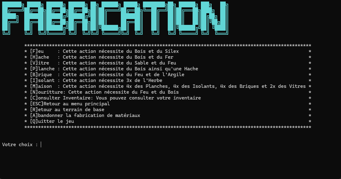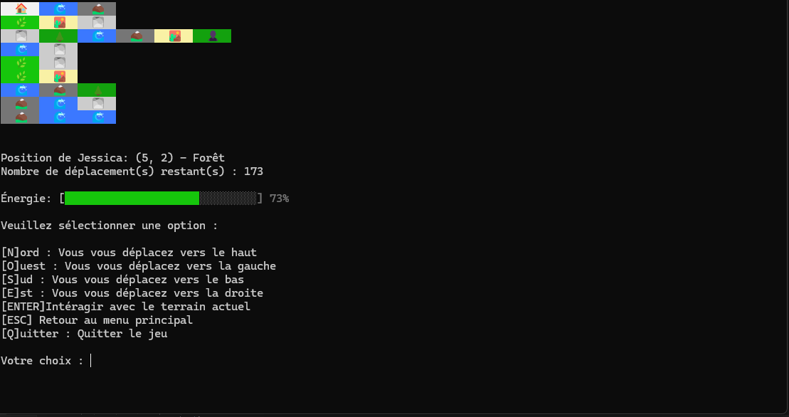 Jeu d'aventure textuel en C# où le joueur doit survivre en explorant une carte 2D. Le joueur collecte des ressources, crafte des objets et gère son inventaire pour progresser. Le jeu utilise une architecture modulaire et sauvegarde la progression en JSON.